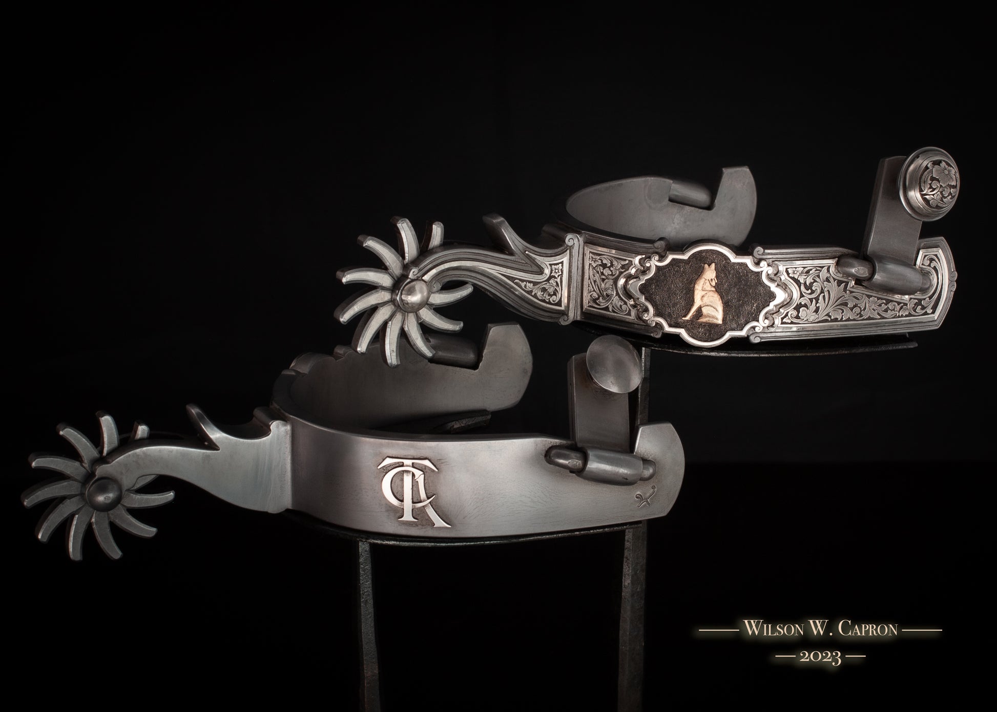Growing up there wasn’t anything that scared me anymore than hearing a close coyote sing their song. Each one has a different tune that could send me under the covers in a ball. Today their howling creates a different emotion in me. It represents a resilience and determination to survive regardless of the changes the environment offers. The coyote is a survivor and adapts to whatever is going on around them. One of my favorite animals without question. I sculpted the coyote in 14k gold with relief engraved sterling silver overlays surrounding it. The rowels have fine silver inlays on curved tines representing the ever changing journey that we all travel.